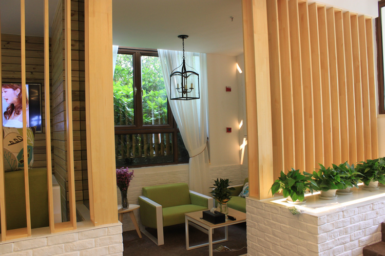 進(jìn)門原來的樓梯口,用原木和玻璃隔斷做了間洽談室。